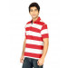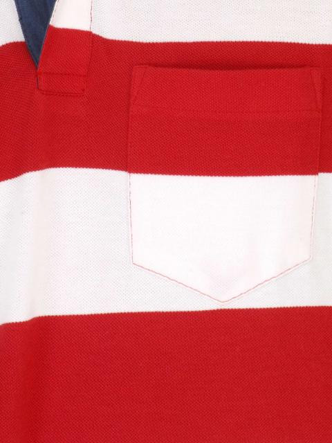 Red and white striped T-shirt made of 100% cotton, has a red ribbed collar and tape detailing on the inseam, short buttoned placket, short sleeves with ribbed cuffs, patch pocket on the upper left chest and a vented hem