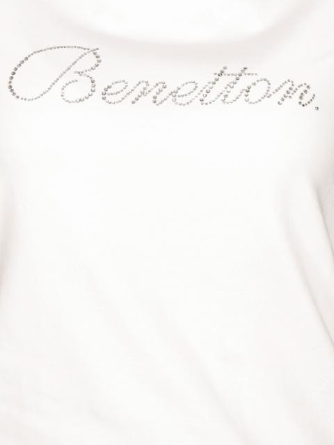 White round neck t-shirt made of 93% cotton and 7% elastine, with short sleeves and brand name in crystal embellishments on the chest