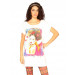 White boat neck t-shirt made of 65% polyester and 35% cotton, with short sleeves, and graphic on the front