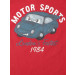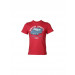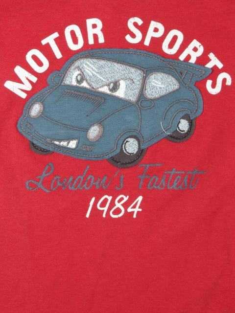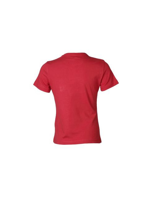 Red round neck T-shirt made of 100% cotton, has short sleeves and graphic print and applique work on the front