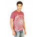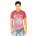 Red melange round neck t-shirt made of 60% cotton and 40% polyester, has a ribbed round neckline with tape detailing on the inseam, short sleeves and slightly distressed look print on the front that spills over to the back on the left side seam