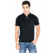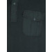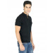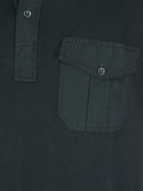 Black woven mandarin neck T-shirt made of 100% cotton, that has short sleeves with ribbed cuffs, fabric collar, ribbed buttoned placket, patch pocket on the left chest with buttoned flap, and a ribbed hemline