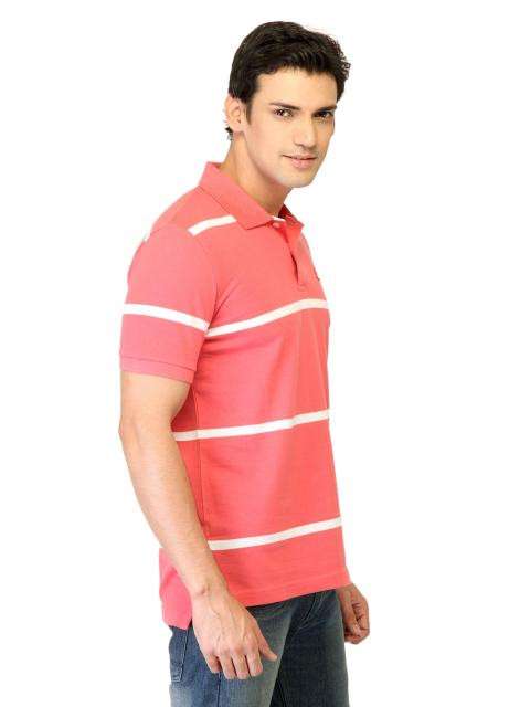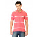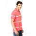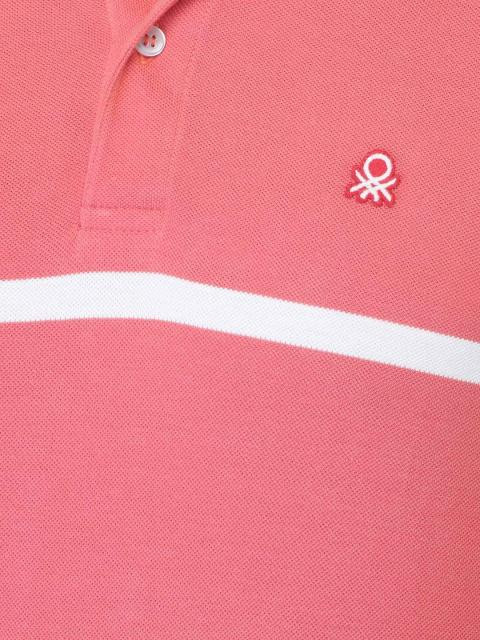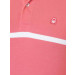 Pink polo T-shirt made of 100% cotton, has white stripes, short sleeves, ribbed collar and cuffs, tape lining on the inseam of the collar, brand logo embroidered on the upper left chest and a vented hem