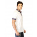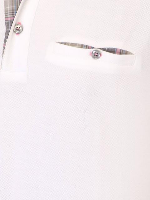 White polo T-shirt made of 100% cotton, has a plaid fabric collar with tape detailing on the inseam, short sleeves with rolled cuffs made of plaid fabric with buttoned flaps, buttoned chest placket, welt pocket with a buttoned closure on the left chest and a vented hem