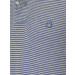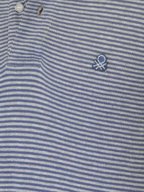 Blue and grey pique, striped polo T-shirt made of 100% cotton, has a grey ribbed collar with tape detailing on the inseam, short sleeves with quartz pink tipped ribbed cuffs, buttoned chest placket, brand tab appliqued on the left chest and a vented hem