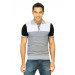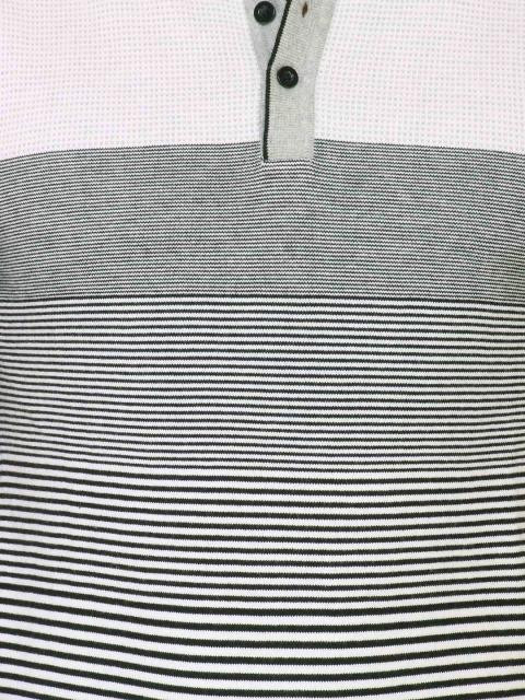 White and black polo neck T-shirt made of 100% tricot wool, has a ribbed collar with a buttoned chest placket, short sleeves with ribbed hems, and has a ribbed hemline