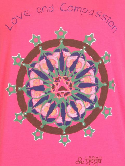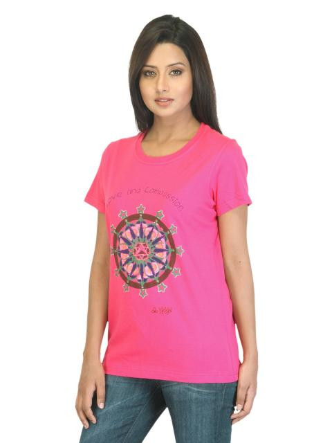 Bring out the trendy fashionista side of you with this fuchsia pink graphic tee from urban yoga. The graphic print is all about “love and compassion”. Team this T-shirt with black shorts or skinny jeans and high heels.