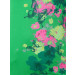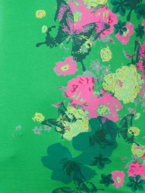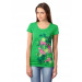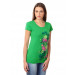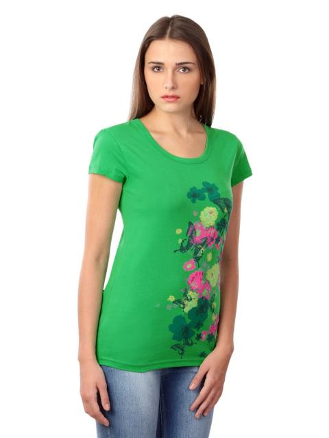Green T-shirt, has a round neck, short sleeves and graphic floral print on the left side