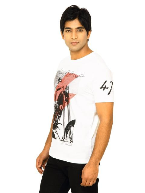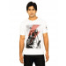 White round neck t-shirt made of 100% cotton, with short sleeves and has graphic print on the front and on left sleeve
