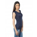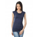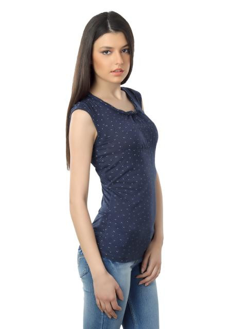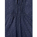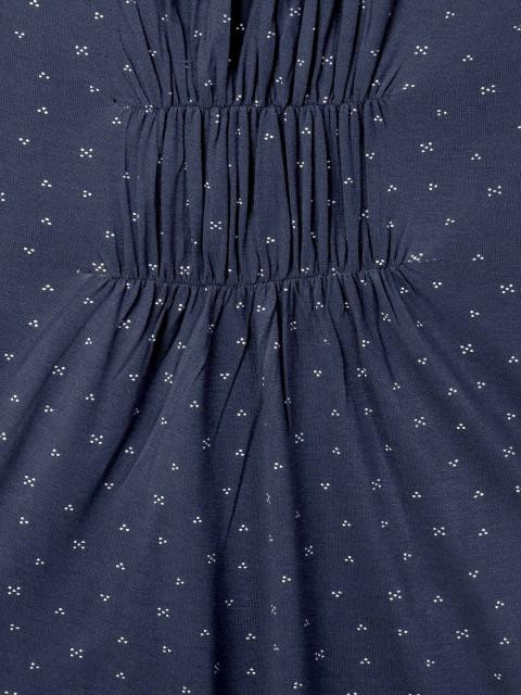 A midnight blue top with tiny white prints scattered all over, round neck with folds around the neckline, elasticated stitches at the yoke to give a pleated effect and short sleeves