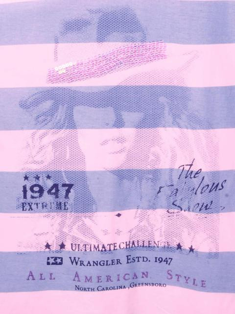 Style NoteOn a regular day when one wants to go to the mall or just for coffee it is easy to just slip on a simple shirt. wrangler takes casual to the next level.Product DetailsPink and lavender round neck top, has a short, ruffled raglan sleeves with a tab on the shoulder and sequin and print on the chestMaterial and Care100% cottonMachine wash with warm waterWash dark colours separatelyTurn inside out before washingDo not bleachSize and FitThe model (height 5'8'' chest 33'' ) is wearing a size MStyle Note