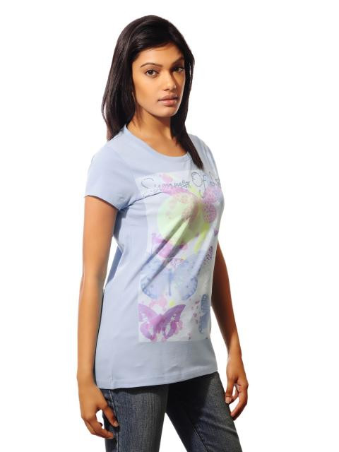 An essential for every woman's wardrobe, this blue T-shirt from wrangler is a cool, wearable top to add to your collection. While the graphic print and crystal embellishments adds to your femininity, the soft cotton fabric keeps you comfy all day. Pair it with skinny jeans and sandals for a casual look.