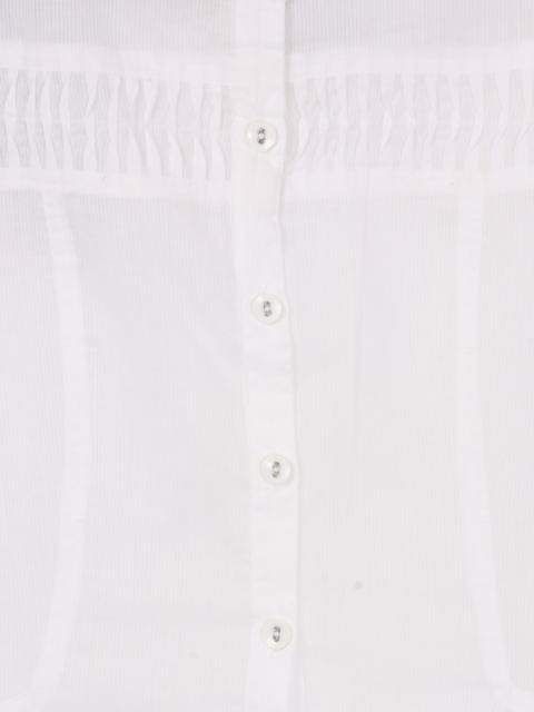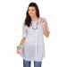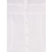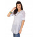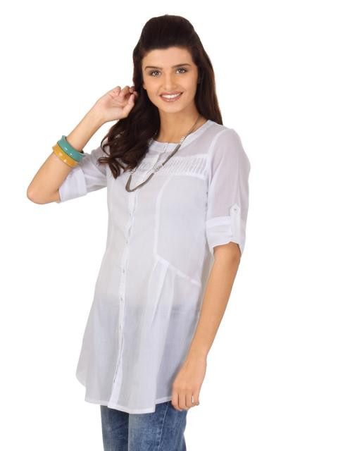 White tunic with woven stripes, has a round neckline, full buttoned placket, three quarter sleeves and stitched detail on the chest