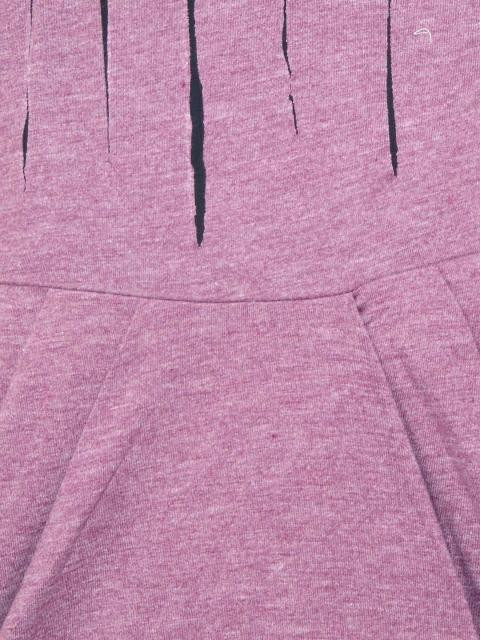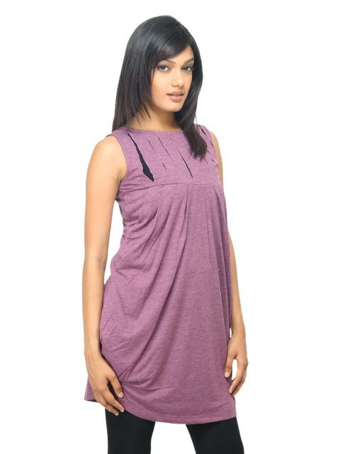 Purple sleeveless tunic top made of knitted, blended viscose fabric, has a round neck, slash detail on the chest, flaring tucks from the midriff and skirt gathered at the sides to create slightly puffed shape