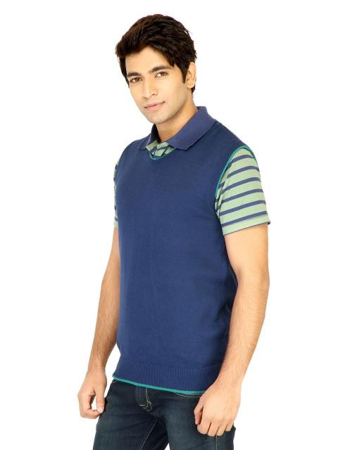 The green tipped ribbing add smooth styling to this navy blue knit sleeveless vest from turtle. The cotton fabric keeps you feeling comfortable all day, while the fashionable cuts offer a flattering Fit. Part of the proceeds from the sale of this product go towards the Save Turtle project in collaboration with WWF and Wildlife Society of Orissa, making it an environment friendly choice. Team this with shirts or t-shirts and jeans.