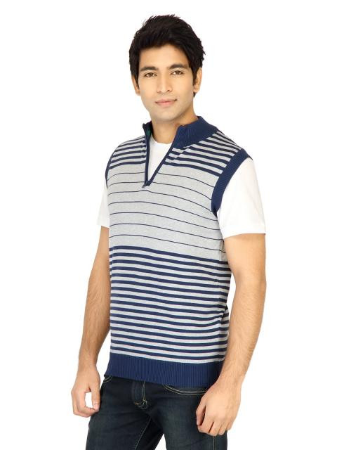 The navy blue stripes and ribbing add smooth styling to this grey knit sleeveless sweater from turtle. The cotton fabric keeps you feeling comfortable all day, while the fashionable cuts offer a flattering Fit. Part of the proceeds from the sale of this product go towards the Save Turtle project in collaboration with WWF and Wildlife Society of Orissa, making it an environment friendly choice. Team this with shirts or t-shirts and jeans.