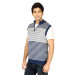 Grey knit sleeveless sweater made of 100% cotton, has navy blue stripes in varying widths, navy ribbed armholes and mock neck with a zippered placket and ribbed hemline