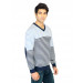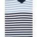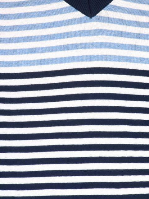White knit pullover made of 100% cotton, has light blue and navy blue stripes, long sleeves with navy ribbed cuffs, navy blue ribbed V-neck with white tipping, navy blue knit elbow patches and a ribbed hemline