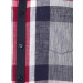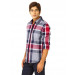 Navy blue and red checked shirt made of 100% cotton, has a raw look, full sleeves and buttoned cuffs, tipped collar, front buttoned placket, curved hem and pocket on the left chest