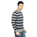 Grey and black striped round neck sweater made of 80% lambswool and 20% nylon, has full sleeves with ribbed cuffs and a ribbed hem