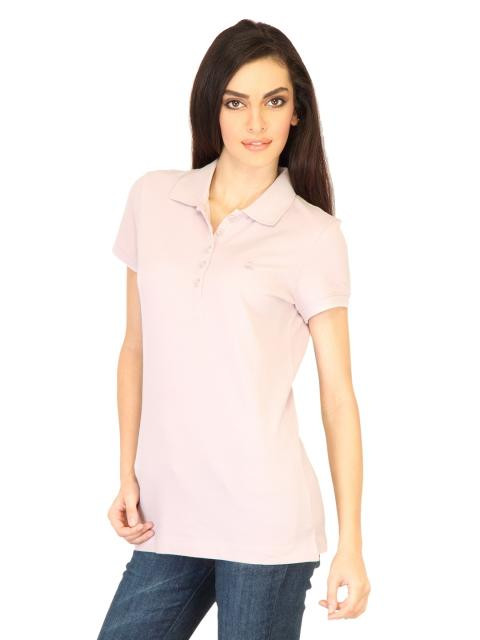 Pink polo T-shirt made of 100% cotton, has short sleeves, ribbed collar with a buttoned chest placket, branding on the left chest and a vented hem
