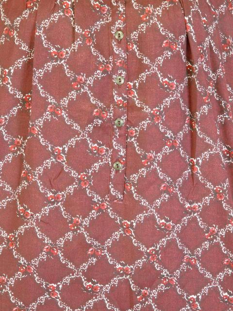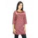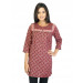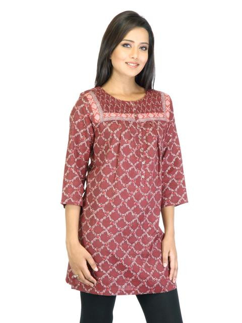 Maroon tunic, has three-quarter sleeves, round neck, yoke with stitch detailing, slightly ruched on the yoke, buttoned chest placket and split side seams