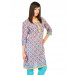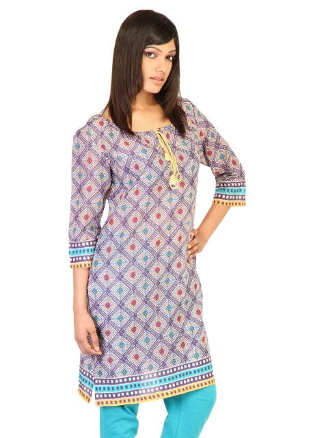 Purple printed kurta made of 100% cotton, has three-fourth sleeves with border design on the cuffs, round neckline with a drawstring and small keyhole closure, printed border design on the hemline and slit side hems