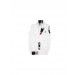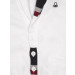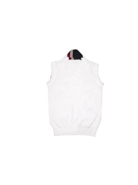 White sleeveless sweater with a V-neck, a lapel collar, has a buttoned placket, brand logo on left and ribbed hem