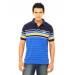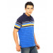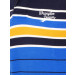 Light blue polo neck t-shirt with navy blue, yellow and white stripes, made of 100% cotton, has a tipped collar and buttoned chest placket, short sleeves with ribbed hems, vented hem and embroidered branding on left chest
