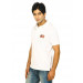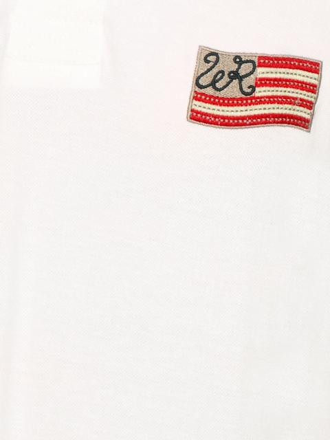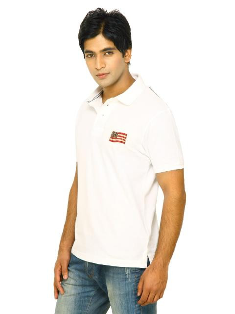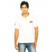 White polo neck t-shirt made of 100% cotton, with a ribbed and tipped collar, buttoned chest placket, short sleeves with ribbed hems and branding on left sleeve, vented hem, stitch detailing on the back neck and shoulder line, and appliquéd embroidered badge on left chest