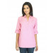 Pink and white striped shirt made of 100% cotton, has a small spread collar, a V-neckline, 3/4th sleeves with buttoned cuffs and a mid-arm tab, full buttoned placket and a curved hem