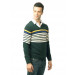 Green and cream striped V-neck sweater made of 100% cotton, has full sleeves with ribbed cuffs, ribbing around the neck and hemline, and branding appliquéd above the hemline