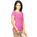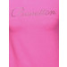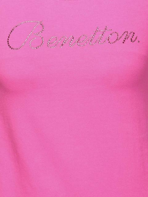 Hot pink short-sleeved round neck t-shirt made of 93% cotton and 7% elastane, with a softly ribbed neckline and brand name in crystal embellishments on the chest