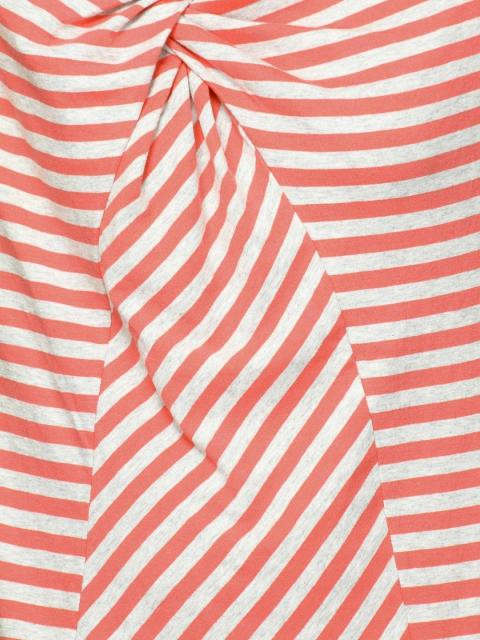 Grey and orange knotted striped t-shirt made of 100% cotton, with dolmon sleeves, and has an asymmetrical neckline and front panel