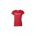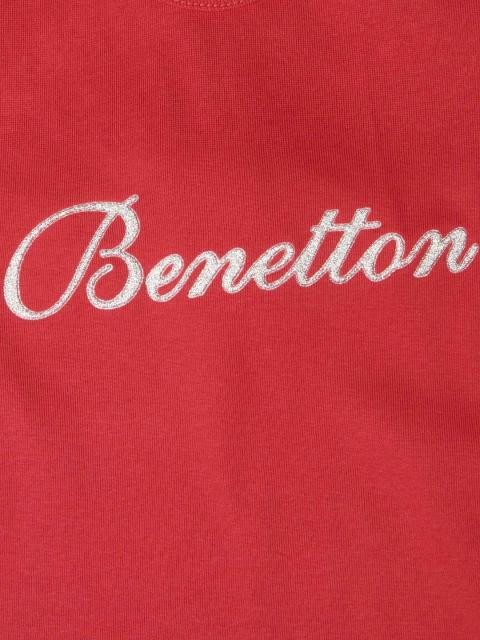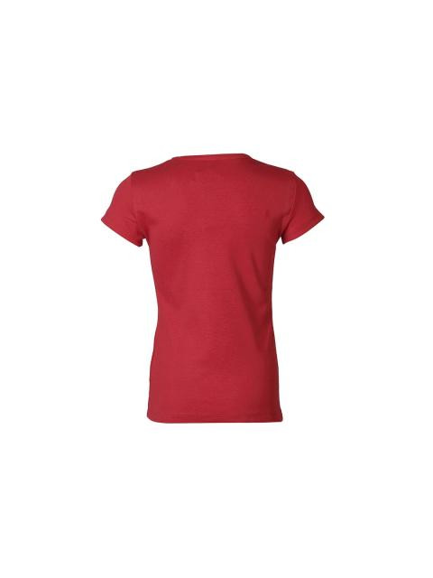 Red round neck top, made of 100% cotton, has short sleeves and rubber print on the chest