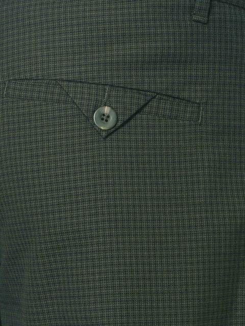 Black and brown checked trousers, has a flat front, two side pockets, buttoned flap closures on back pockets, zippered and buttoned closure and belt loops at the waist