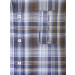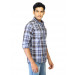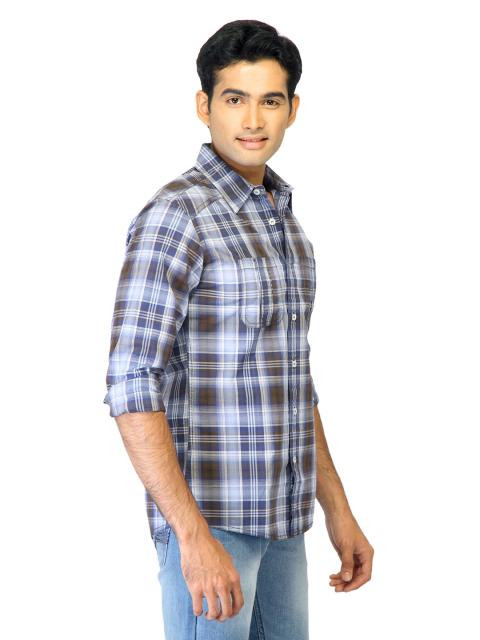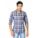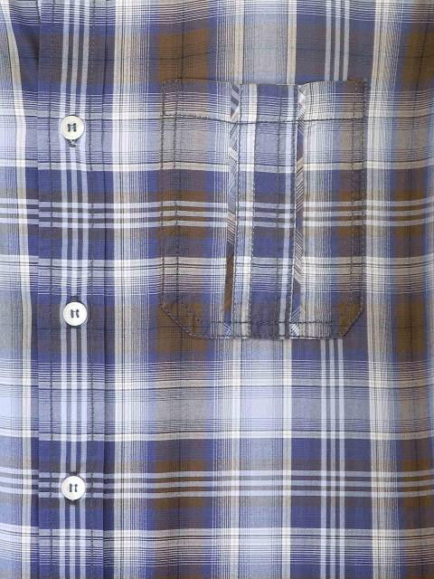 Blue check shirt with white accents, made of 100% cotton, has full sleeves with buttoned cuffs, tipped collar with a buttoned front placket, two patch pockets on the chest with patch detailing and a curved hem
