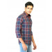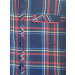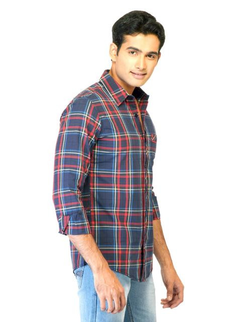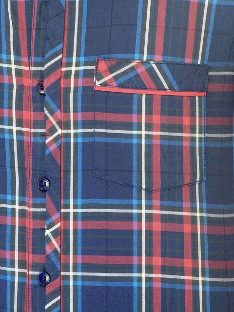 Dark blue and red check shirt with white and blue accents, made of 100% cotton, has full sleeves with buttoned cuffs, tipped collar with a buttoned front placket, patch pocket on left chest and a curved hem