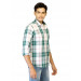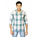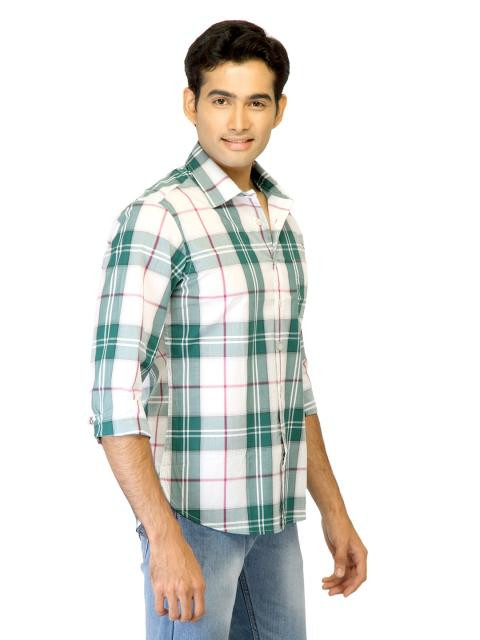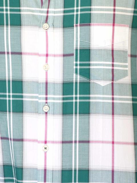 Green and white check shirt with pink accents, made of 100% cotton, has full sleeves with buttoned cuffs, tipped collar with a buttoned front placket, patch pocket on left chest and a curved hem