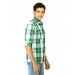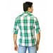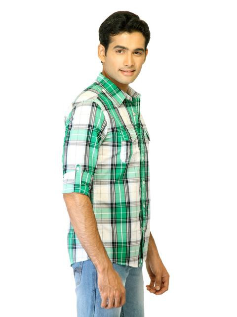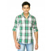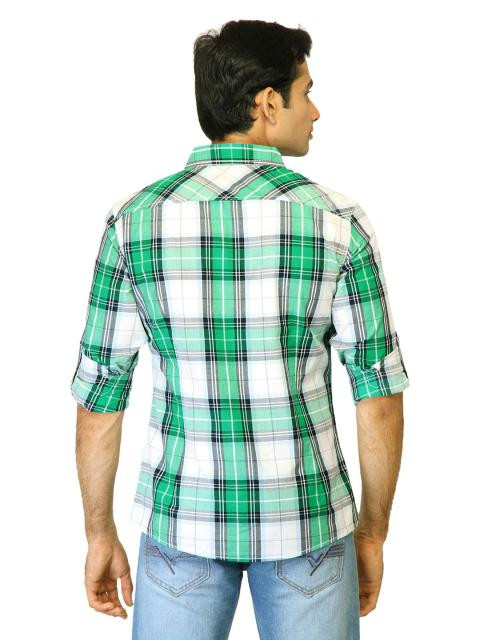 Green, white and black check shirt with light blue accents, made of 100% cotton, has full sleeves with button cuffs, tipped collar with a buttoned front placket, buttoned flap pockets on either chest with an embroidered Big Ben logo on the left pocket flap, and a curved hem