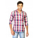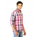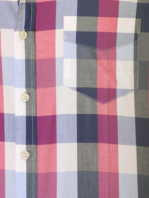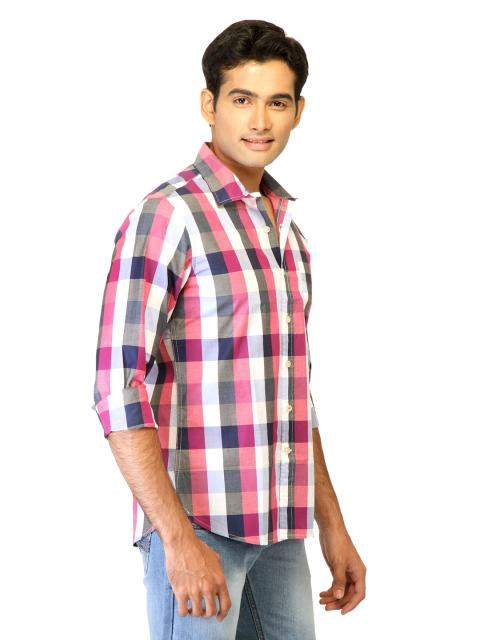 Purple, pink, grey, blue and white check shirt, made of 100% cotton, has full sleeves with buttoned cuffs, tipped collar with a buttoned front placket, patch pocket on left chest and a curved hem