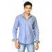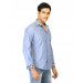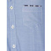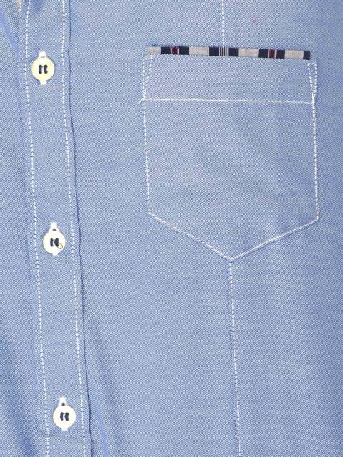 Light blue woven shirt made of 100% cotton, has long sleeves with buttoned cuffs that have a plaid fabric lining, buttoned placket on the front, patch pocket on the left chest with a plaid piping on the mouth and a curved hemline