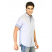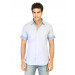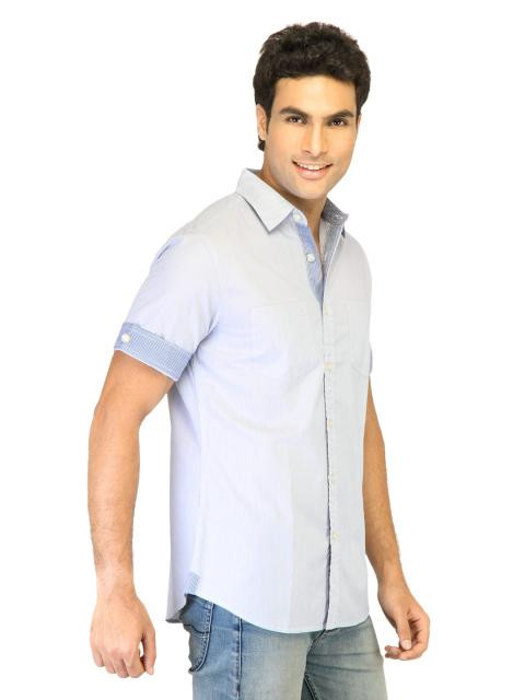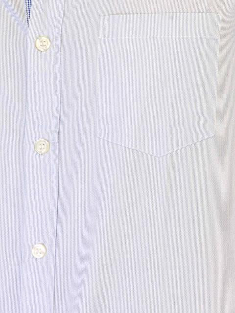 Blue and white striped shirt made of 100% cotton, has short sleeves with roll-over hems in checks and buttoned flaps, tipped collar with a buttoned front placket, patch pockets on either chest and a curved hem