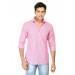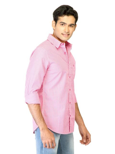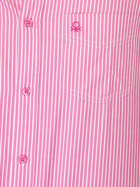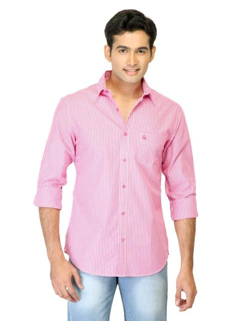 Pink shirt with white stripes, made of 100% cotton, has full sleeves with button cuffs, tipped collar with a buttoned front placket, patch pocket on the left chest with an embroidered Big Ben logo and a curved hem