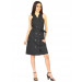 Black sleeveless dress made of 98% cotton and 2% spandex, with a flapped V-neck, button-down front, two waist pockets and a waist belt