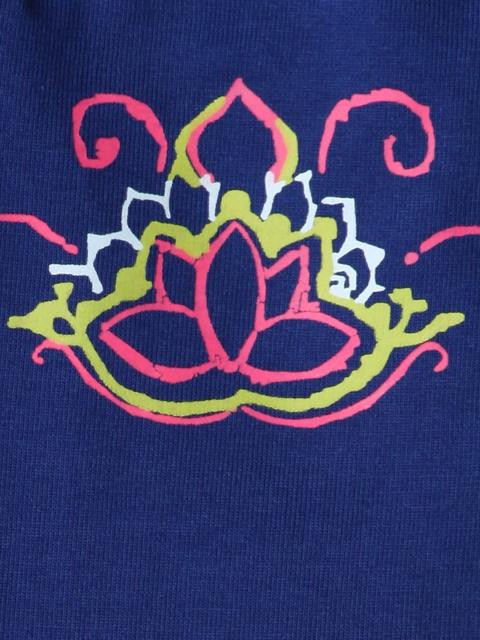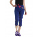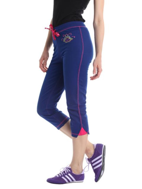 Blue capris made of 95% cotton and 5% lycra, has an elasticated waistband and drawstring, graphic print on the left side below the waistband and a panel on the hem with the brand logo appliqued