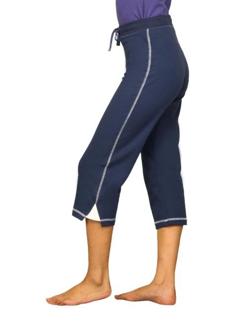 This pair of navy blue capris from urban yoga is an essential garment in a woman's wardrobe. Specially designed with spandex for easy movement, the cotton fabric keeps you dry, comfortable and fresh. Any hard seam like zippers or buttons have been carefully avoided for a comfort feel. The stitch detailing in a contrast colour adds a stylish touch, while the drawstrings with urban yoga branding all over them can either be showed off as a bow or tucked in to alter between a funky and prim look. The brand tag has been printed and consciously not stitched so that nothing comes between you and comfort. You can couple this comfort fit capirs with stylish tops - a slim fit one for exercise regimes or a loose fit one for casual occasions.
