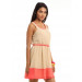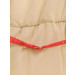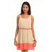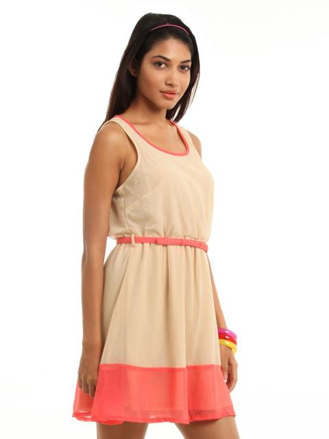 Beige sleeveless dress, has a round neckline with peach coloured piping around it, key hole detailed with a button at the nape of the neck, gathers at the waist which flair, belt loops with a peach belt through it, peach panel at the hemline and lining