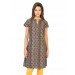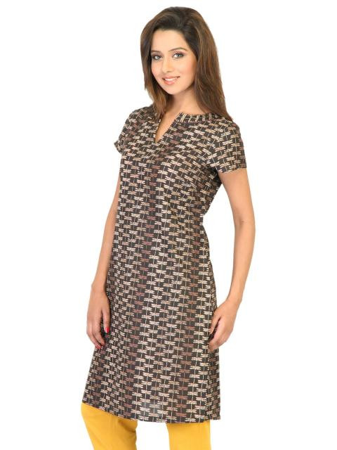 Brown printed kurta made of 100% cotton, has a slightly distressed look dragonfly print, mega sleeves, slightly gathered round neckline with tape detailing, a slit opening on the front and slit side hems