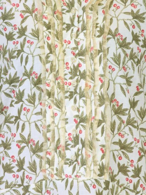 Off-white printed kurta made of 100% cotton, has three-quarter sleeves with gathered cuffs and sheer gold ribbon on the cuffs, round neckline with a buttoned placket that extends till the waist, pleats and gold ribbon detailing on either side of the placket and stitched pleat detailing on the back